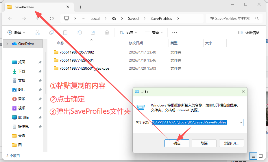 复制这一段内容使用Win+R打开👉【%APPDATA%\..\Local\R5\Saved\SaveProfiles】