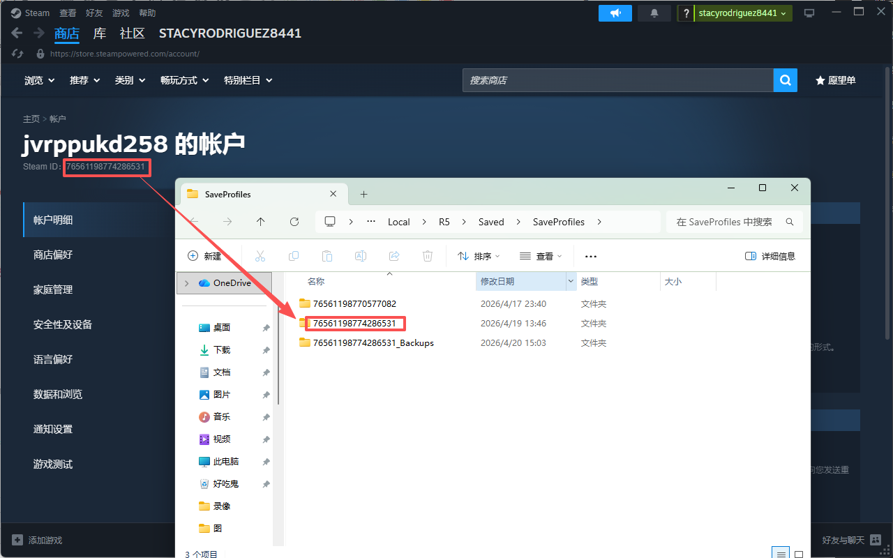 在弹出来的【SaveProfiles】文件夹中会你的steam64位ID为名称的文件夹