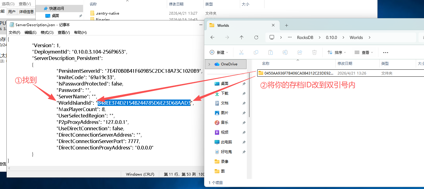 将WorldIslandId后面双引号内的存档ID改成你的存档ID(要记得保存文件)