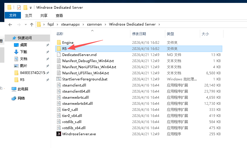 在你搭建的风启之旅专用服务器根目录Windrose Dedicated Server文件夹中会有一个【R5】文件夹